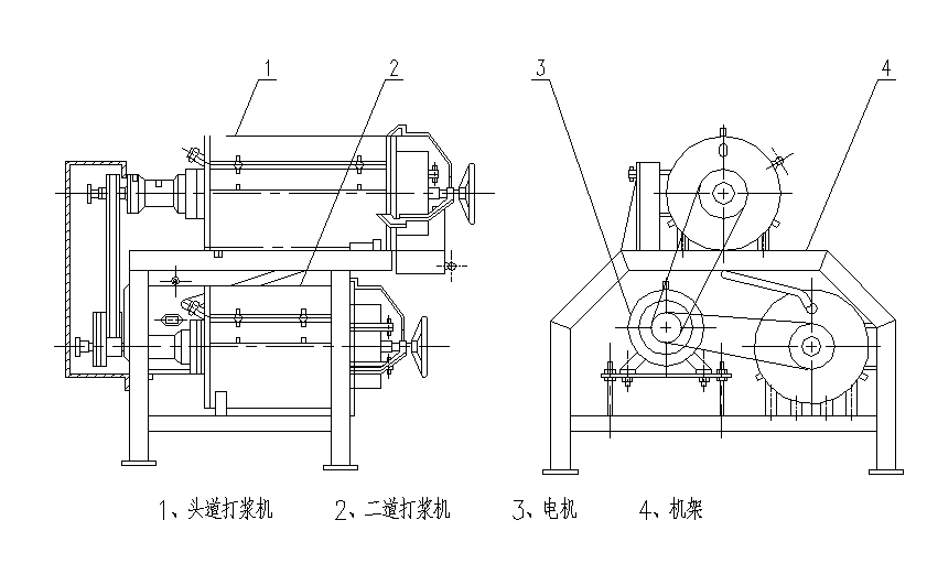 ★ 主要結(jié)構(gòu):傳動系統(tǒng)、軸承座、套軸、筒后蓋、擋漿盤、筒身、花鍵軸、篩網(wǎng)、刮板(或打漿棒)、筒前蓋、機架等