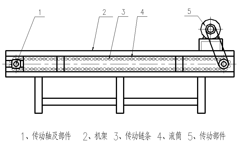 該機(jī)由機(jī)架、滾筒(不銹鋼管φ51×1.5兩頭用工程塑料密封)、廢果輸送裝置、電機(jī)、傳動系統(tǒng)、拉緊裝置等組成。