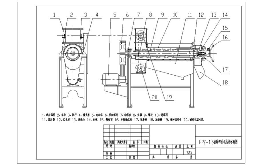 由前支座、進(jìn)料斗、螺旋、過濾網(wǎng)、盛汁器、后支座、出渣槽等零件組成,螺旋主軸左端支承于滾動(dòng)軸承座內(nèi),右端支承于手輪軸承座中,電動(dòng)機(jī)通過一對三角皮帶輪驅(qū)動(dòng)螺旋進(jìn)行工作。
