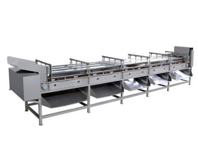 滾筒分級(jí)機(jī)重要部件為傾斜度為3~5°左右裝置的圓筒篩,篩網(wǎng)用不銹鋼板沖孔制成,孔徑由小到大自圓筒篩的高 端向低端擺放。隨圓筒篩的旋轉(zhuǎn)水果逐級(jí)由小到大從篩孔中漏出,特大水果則從圓筒篩結(jié)尾滾出。