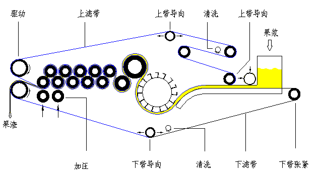 3、高壓榨取區(qū):濾帶之間的果漿餅在“S”形的纏繞件中由壓榨輥繼續(xù)取汁,而且榨輥逐漸減小,壓力逐漸加大。最后二級榨輥在它的一面各有一個榨輥由氣囊的推力共同向上輥加壓,使果汁最大限度被榨出。