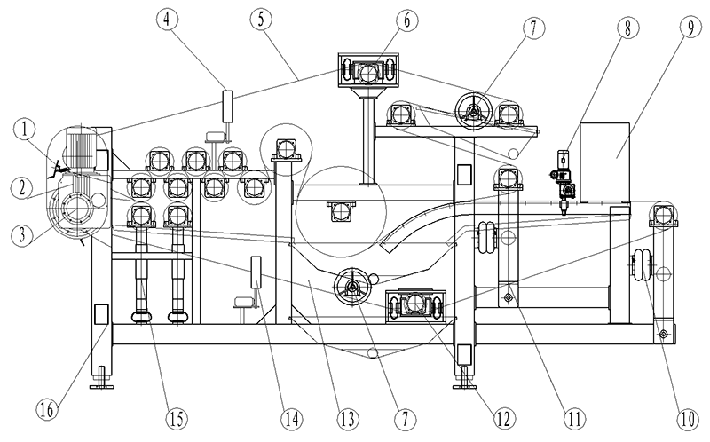 見附示意圖, 該機有機架、上下驅(qū)動軸,減速驅(qū)動總成,壓輥組合,壓濾帶、清洗帶組件、進料組件、漲緊裝置、帶糾偏組件、增壓裝置、安全保護裝置,氣電控制裝置、清洗水過濾裝置等組成。